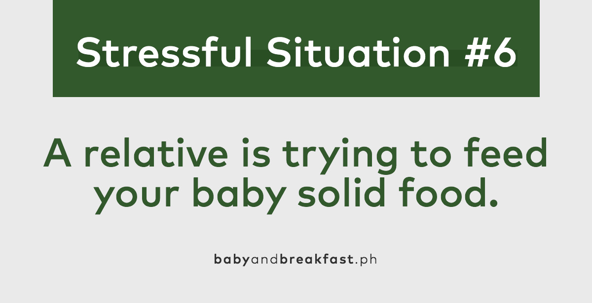 Your family and friends will always mean well when they try to get some time in with your baby. But if you spot a tita or cousin trying to feed your baby something they’re just not ready for, make sure to calmly explain whether or not you’re giving your baby solid foods. This is also something you can do when you arrive to avoid mix ups later on. You can even suggest other things your relatives can do aside from feeding your baby, like changing diapers or going for a walk.